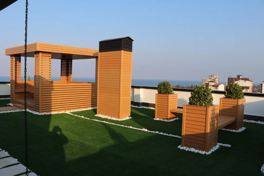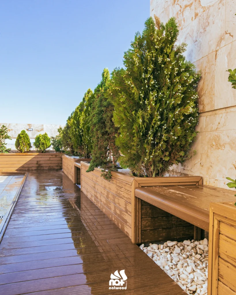طراحی مدرن با حس طبیعی چوب، ساختهشده از مبلمان چوب پلاست مقاوم در برابر چهار فصل، با هماهنگی کامل با دکینگ، فلاورباکس و نرده، برای فضایی شیک و پایدار.